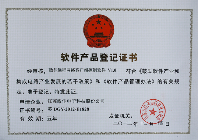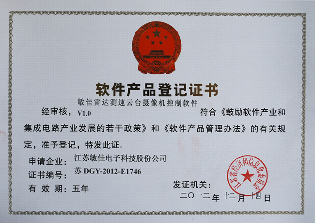 2012年12月14號(hào),我公司獲得了由江蘇省經(jīng)濟(jì)和信息化委員會(huì)頒發(fā)的軟件產(chǎn)品登記證書。此次,又有二個(gè)產(chǎn)品經(jīng)審核符合《鼓勵(lì)軟件產(chǎn)業(yè)和集成電路產(chǎn)業(yè)發(fā)展的若干政策》和《軟件產(chǎn)品管理辦法》的有關(guān)規(guī)定,被認(rèn)定為軟件產(chǎn)品,其中包括:敏佳雷達(dá)測(cè)試云臺(tái)攝像機(jī)控制軟件V1.0、敏佳遠(yuǎn)程網(wǎng)絡(luò)客戶端控制軟件V1.0。